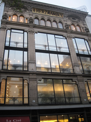 Herzmansky was one of the first department stores in Vienna. It was founded by August Herzmansky in 1863. The store was located on the Mariahilferstrasse 26-30/Stiftgasse 3 in the seventh district of Vienna. Since 1998 the buidling holds a Peek & Cloppenburg fashion store. Unfortunately most of the building was destroyed in a fire, only a small part was left undamaged and showcases the original fine decoration – as you can see above.