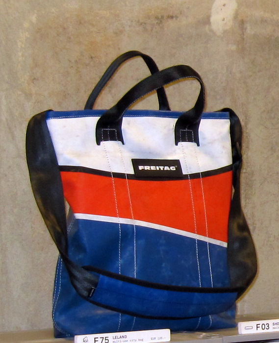 FREITAG is known for its messenger bags made from used truck tarpaulins. The bags are cut by hand and finished with worn bicycle tubes and car seat belts.