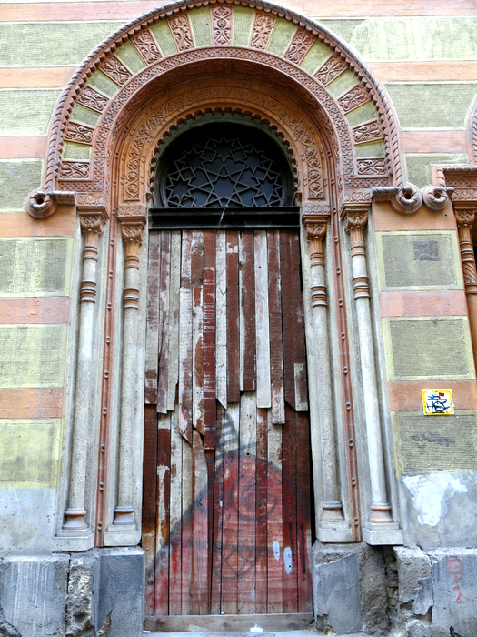 One of the side entrances to the Rumbach Street synagogue in the Belváros district of Budapest. The synagogue was built in 1872 to the design of the Viennese architect Otto Wagner. The beautiful buidling is closed due to its bad need of restoration.